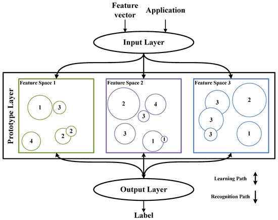 The RCE-NN is a supervised machine learning algorithm designed to learn and recognize the feature regions of input vectors [18]. Each neuron generated during the learning process constitutes a feature region associated with a label. Because the feature space of a neuron is organized by application, RCE-NNs can be used to recognize or learn multiple applications independently. Figure 1 illustrates an example of an RCE-NN structure comprising three feature spaces from three different applications. In Figure 1, each application’s feature vector is two dimensional, the neuron’s feature region is represented as a circle, and the numbers within the circles represent labels. The number of feature spaces is equal to the number of applications, and the dimensions of the feature vector and the shape of the feature region are chosen for each application. The RCE-NN consists of an input layer, a prototype layer, and an output layer. The input and output layers are connected to all the neurons generated in the prototype layer. The input layer transfers the input feature vector to the neurons in the prototype layer. Neurons in feature spaces different from the input application remain inactive. However, neurons in the feature space of the input application, whose input feature vector falls within the feature region, are activated. The activated neurons calculate the distance between the center point of the feature region and the input feature vector, transferring the result to the output layer. The output layer then generates and adjusts neurons or outputs the recognition results.