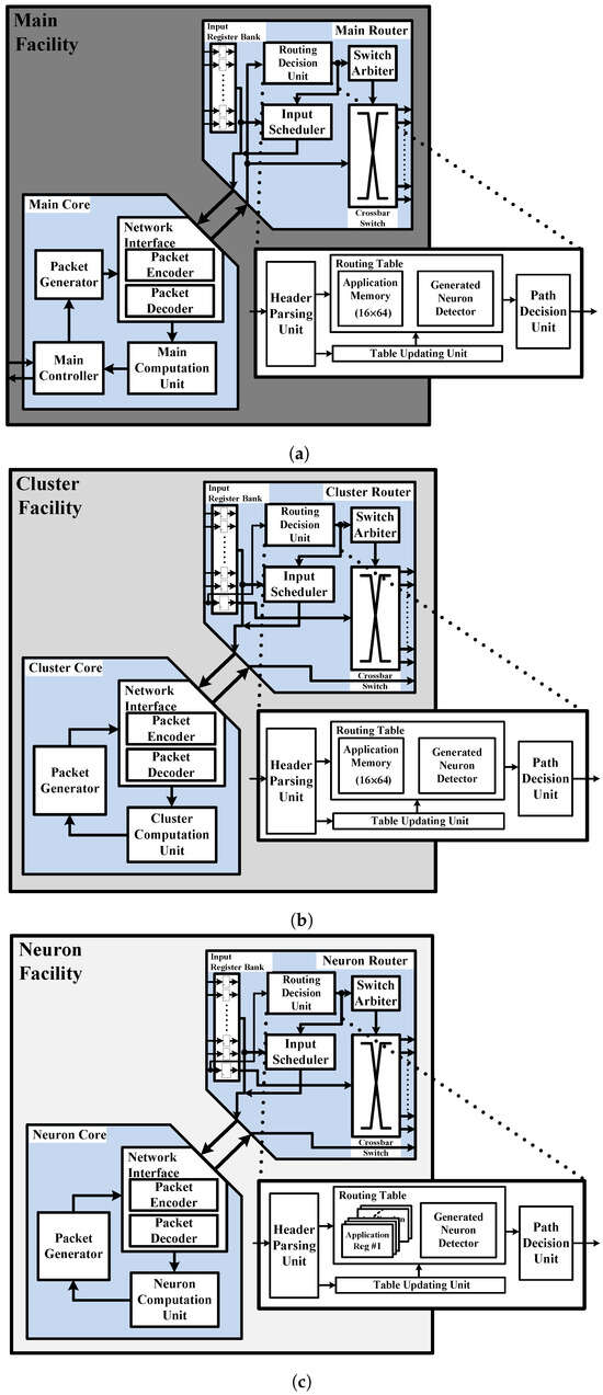 Block diagrams of the facilities: (a) main facility; (b) cluster facility; (c) neuron facility.