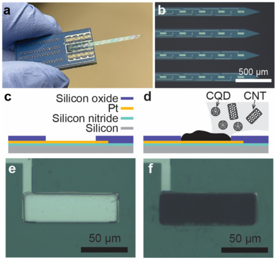 Carbonized Pt microelectrode fabrication for FSCV-based dopamine detection. Photographs of (a) the probe and (b) tip of the probe taken using a Zeiss Examiner; schematic views of (c) the microfabricated Pt microelectrode and (d) the carbonized Pt microelectrode, 30 × 100 μm; and micrographs of (e) the bare Pt microelectrode and (f) carbonized Pt microelectrode, 30 × 100 μm.