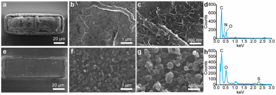 SEM images of CNT–CQD–PPy coated onto a Pt microelectrode (the scales are (a) 20 µm, (b) 1 µm, and (c) 200 nm) and (d) their EDAX analysis. SEM images of CNT–CQD–PEDOT coated onto a Pt microelectrode (the scales are (e) 20 µm, (f) 1 µm, and (g) 400 nm), and (h) their EDAX analysis.