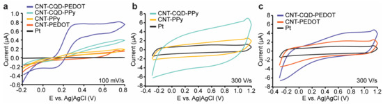 Electrochemical analysis of nanocomposite-coated Pt microelectrodes: (a) CV diagrams at a scan rate of 100 mV/s; (b) FSCV of CNT–PPy, CNT–CQD–PPy, and Pt bare microelectrodes at a scan rate of 300 V/s; (c) FSCV of CNT–PEDOT, CNT–CQD–PEDOT, and Pt bare microelectrodes at a scan rate of 300 V/s.