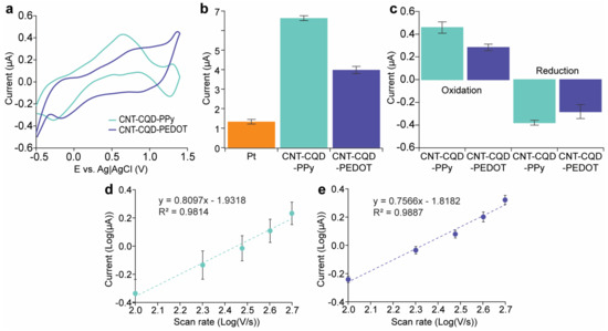The correlation between scan rate (100–500 V/s) and anodic peak current for both the CNT–CQD–PPy and CNT–CQD–PEDOT have been investigated (Figure 5d,e). A linear relationship is observed between scan rate and anodic peak current. This relationship shows a slope of 0.8097 (R² = 0.9814) for CNT–CQD–PPy and 0.7566 (R2 = 0.9888) for CNT–CQD–PEDOT. In both the CNT–CQD–PPy and CNT–CQD–PEDOT layers, the anodic peak current is proportional to the scan rate, approaching a value close to 1, suggesting that the dopamine redox reaction is controlled by adsorption (Figure 5d,e) [4].