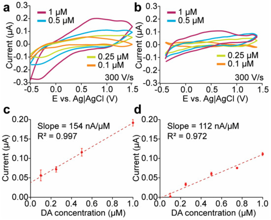Given that the background current is proportional to the surface area, it can be assumed that the CQDs, possessing small dimensions and a high surface area, significantly increase the overall surface area of the nanocomposite [40]. The increased surface area due to incorporating CQDs is evident in the recorded background current signals shown in Figure 4b,c. Thus, because a large surface area also increases the sensors’ sensitivity to electroactive neurochemicals for electrochemical detection using FSCV [4], we will focus on the performance of CNT–CQD–PEDOT and CNT–CQD–PPy for further analysis in Section 3.3 and Section 3.4.