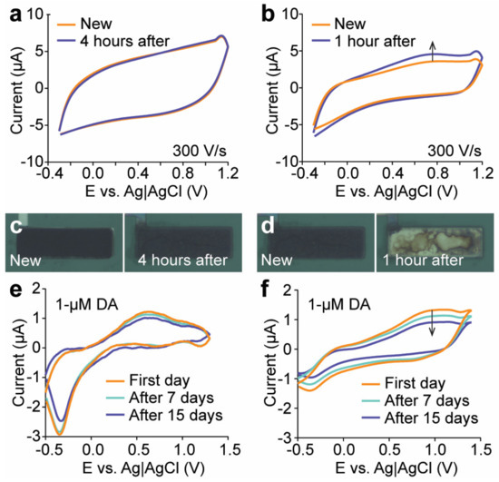 In FSCV, the electrode is continually scanned to ascertain its stability until a constant, drift-free response is observed. The stability analysis of the CNT–CQD–PPy and CNT–CQD–PEDOT layers using FSCV are displayed in Figure 7a,b. We intended to apply the FSCV waveform for a period of four hours using a flow cell instrument. During the four-hour test of the CNT–CQD–PPy layer, no significant change occurred in its background current (Figure 7a). In contrast, the background current of the CNT–CQD–PEDOT layer demonstrated a drifting pattern after the first hour. When observed with an optical microscope, it was apparent that the CNT–CQD–PEDOT layer was no longer adhered to the microelectrode surface, so the experiment was concluded at that time (Figure 7d). The CNT–CQD–PPy layer remained adhered to the microelectrode’s surface by the conclusion of the four-hour experiment period (Figure 7c).
