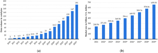 (a) Amount of data created, collected, and used worldwide from 2010 with predictions up to 2025 (in zettabytes) [1]; (b) Global big data analytics market size from 2021 to 2029 (in billions of US dollars) [2].