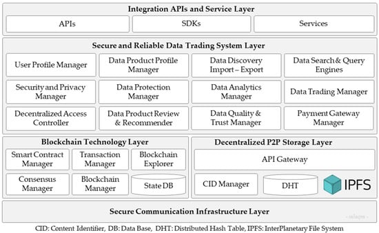 - The Secure and Reliable Data Trading System Layer is a middleware that provides fair, transparent, secure, and trustworthy data trading features. It comprises the following principal modules: The user profile manager manages user profile credentials, roles, authentication, and authorization, ensuring accurate maintenance and secure access to user data. The data product profile manager allows the creation and management of data product profiles, which include metadata and usage terms associated with the datasets being traded. It also ensures accurate cataloging and retrievability of data products. The data protection manager enforces data protection policies, ensuring compliance with regulations and safeguarding data integrity. The data search and query engines facilitate efficient searching and querying within the marketplace, enabling users to find the data they need based on various search criteria. The data discovery, import, and export module facilitates the discovery, import, and export of data within the system, ensuring data integrity and accurate formatting during the process. The data analytics manager provides data processing and analytical capabilities, transforming raw data into actionable and valuable insights. The data product review and recommender collect user feedback on data products and recommend products to users based on their profiles, preferences, and past behavior. The data quality and trust manager maintains the data quality and manages trust scores for data products, ensuring adherence to high standards. The data trading manager facilitates data trading between users by overseeing transactions and enforcing the terms of agreed trade deals, including transaction validation, execution, and settlement. In addition, it provides features such as data product profile listing, price modeling, order management, and invoice management. The payment gateway manager handles financial transactions, allowing users to make payments for data products or receive payments within the marketplace. The security and privacy manager ensures that all transactions and data exchanges adhere to the highest security and privacy standards. The decentralized access controller ensures that data access is governed by decentralized policies, thereby enhancing security and user control.