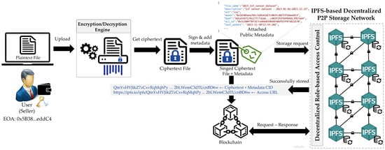 The data are encrypted before being stored off-chain in a secure, censorship-resistant, highly available P2P decentralized storage network such as IPFS, as depicted in Figure 4. First, the plaintext file uploaded by the user is encrypted to generate its ciphertext, which is then signed and tagged with metadata containing the file name, extension, owner address, hash value, and access control list identifier. The signed file with the public metadata is then stored on the IPFS network and the corresponding CID and access URL are recorded in a blockchain-based immutable and shared ledger. Data access is governed by a decentralized RBAC system driven by smart contracts and supported by the blockchain to ensure robust security features and efficient rights management to protect the privacy and integrity of data in multi-party environments.