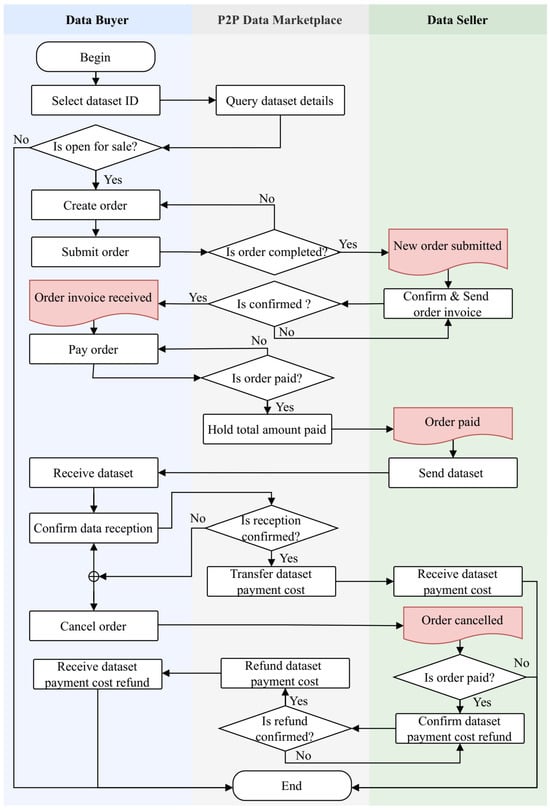 Together, these layers facilitate various functions within the system, leveraging blockchain technology for secure, transparent, and reliable market transactions. By using blockchain technology, the system ensures traceable and verifiable transactions, which promotes trust among users. In addition, P2P decentralized data storage solutions enhance the system’s resilience and mitigate the risks associated with centralized data storage. This architectural framework is designed to establish a secure environment for data trading that ensures reliability, compliance, and user sovereignty in data management.
