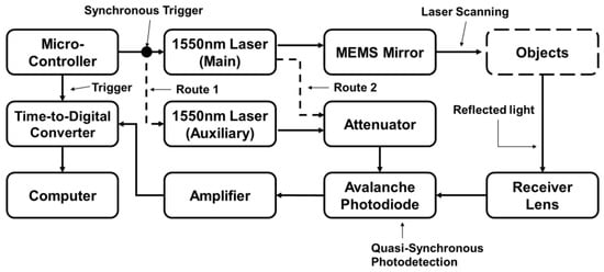 Figure 1 shows a diagram of a MEMS-based LiDAR with synchronized dual-laser beams. A microcontroller (MCU) manipulates the electrical signal to control the entire system. The synchronized signals trigger two separate lasers, and the power density of the auxiliary laser is lower than that of the main laser. The APD detects the reflected light from the main and auxiliary light and converts it into an electrical signal under test. A trans-impedance amplifier (TIA) circuit converts the current signal into a voltage signal and feeds it to a time-to-digital converter (TDC) circuit to calculate the flight time. The trigger signal from the MCU and the detected light signal are the two inputs for the TDC.