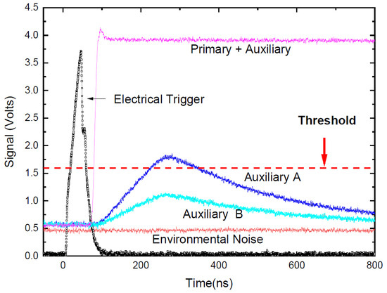 The time sequence of electrical trigger signal, primary and auxiliary lasers, and environmental noise obtained by an oscilloscope. To exceed the threshold, the power coupling of the main light and the auxiliary light must rely on an attenuator to adjust the power of the auxiliary light (A and B).
