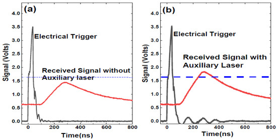 The oscilloscope signal is directly from an APD on detecting reflected light in two types of LiDAR architecture: (a) without an auxiliary laser light and (b) with auxiliary laser illumination. The red solid line displays the value of the light signal, and the dotted line displays the value of the threshold.