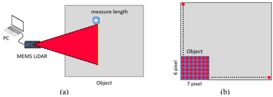 The method and analysis describe the FOV and angular resolution in MEMS-based LiDAR. Conduct the angular resolution test in the situation shown in (a). Configure the environment in compliance with the requirements of the standard test. Use trigonometric functions and point-cloud data to compute the angular resolution; (b) although the transmitted object’s actual size is equal to the proportionate relationship of the site size, users can utilize this information to estimate the approximate number of point clouds.
