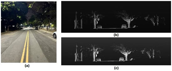 In the university campus environment, we perform the detection range measurement of the MEMS-based LiDAR with the original output data parameters. The test environment consists of a straight road at night with buildings and vehicles present, as shown in Figure 8a. We placed the LiDAR in the middle of the road. The measurement involved moving the target to the maximum detected range and performing lateral movement to ensure accurate detection of the target, which in this case was a human. The target object in this test, a pedestrian, had an average reflectivity of 18%.