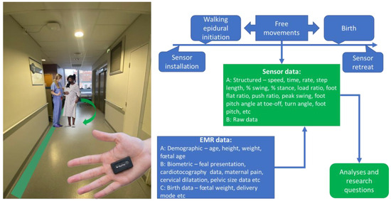 Wearable inertial sensors are small, with sizes varying from extremely small ones to the size of a matchbox []. Different types are commercially available, and the availability of OEM parts allows for custom research-oriented sensor building. Sensor type, number (single or multiple), sensor placement (trunk or extremity), study aims, measurement dataset, and data treatment methods may vary depending on the research question []. As no studies in the context of maternal ambulation in labor exist, it is difficult to analyze the specific challenges associated with using wearable inertial sensors in such conditions. The most common problems may arise from the data quality (parasite readings, non-recognition of maternal activity) and quantity (limited time for ambulation) collected. Synchronization of sensor data and clinical events may present another challenge. Finally, the reluctance of parturients to participate in this research may present a classical obstacle.