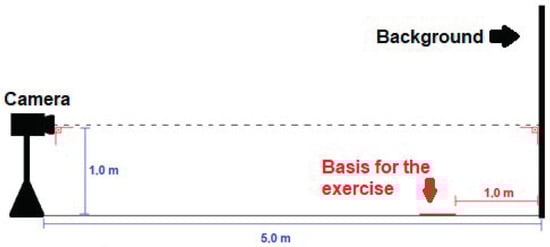 To collect the positional data for the back squat exercises, a digital video camera coupled to a Samsung® smartphone model Galaxy S9 (12 megapixels with 4K UHD resolution 3840 × 2160, Seoul, Republic of Korea) was used. Data were collected with the camera in a stationary position, with the optical axis perpendicular to the participant’s sagittal plane, 1 m from the ground, and 5 m from the background (Figure 1) [33].