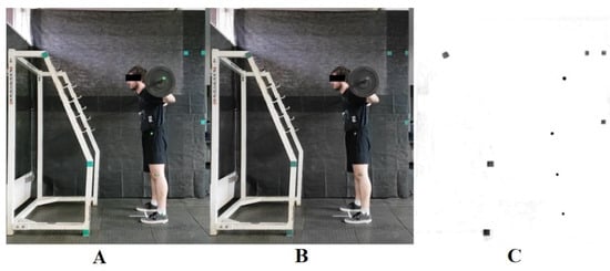 Example of filters applied to videos of back squat exercise. (A) Original video image. (B) Application of the Chroma Key effect, which locates and changes the colour of the markers. (C) Application of the Alpha channel, which subtracts everything that was not selected by the Chroma Key.