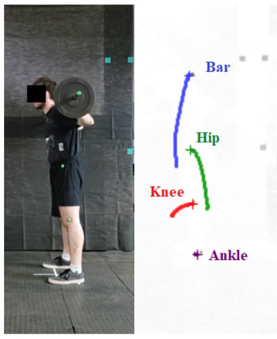 Joint displacement measurements were obtained from the markers placed at the iliac crest (hip), femoral lateral epicondyle (knee), lateral malleolus (ankle), and the barbell (see Figure 1), according to the following formula for Euclidean distance calculation:
