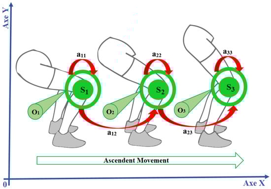 For learning, the data were clustered into groups [29] using the K-means algorithm [49], which generates the states of the HMMs. The k-means cluster formation process is performed using an unsupervised procedure that seeks to minimize distance measures [50]. Figure 4 shows an example of a sequence of three scenes from the relationship between knee positioning during the ascendant movement of the exercise and the form of Markovian modelling that was performed. Each of the three knee positions, defined as states S1, S2, and S3 (trajectory clusters), shows the possibility of stopping the movement or its sequence according to the transition probabilities aij. The Figure 4 also shows the probability of observation for each state Ok.