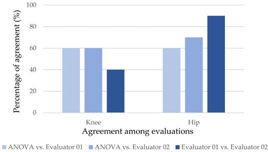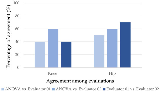 Similar to the work by Porz et al. [60], a comparison was made between the computational tool and human evaluators, and kappa interrater agreement analysis was also performed to verify the agreement between the model and human evaluators and between the human evaluators. The only statistically significant difference in the kappa coefficient was found between human evaluators for the hip in the 0–50% of body weight comparisons. Comparing the percentage of consonance between the model’s responses and the responses of the evaluators and between the evaluators, it was observed that the kappa statistic did not represent the agreement between them very well. This can be seen in comparisons that reached 60% agreement (knee at 50% of body weight) between the model and the human evaluators, but the kappa statistic did not reach significance (k = 0.200 and p = 0.292 for evaluator 01 and k = 0.200 and p = 0.527 for evaluator 02).