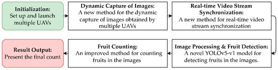 The flowchart outlines the proposed methodological flow for UAV-based fruit counting, which includes the setup and launch of UAVs, dynamic image capture, real-time video stream synchronization, and a novel YOLOv5-v1 model for image processing and fruit detection.