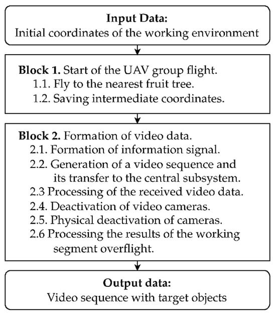 The proposed methodologies for handling video data from individual work zones are structured for the collective processing of multiple fruit trees. This process relies on control and route planning subsystems. The creation of a multi-tiered, distributed software interface, integrated into a centralized system, facilitates the management of the UAV group and allows for immediate interaction with the system’s central module. This innovative approach enables the dynamic generation of images, thereby capturing specific structural objects within the working zone and the confines of the target fruit tree.