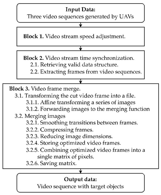 Step 2.2. Upon the successful synchronization of video streams, the block transitions into the “frame extraction from video sequences” state, yielding a collection of software structures. These structures serve as the input for the subsequent video frame merging block.