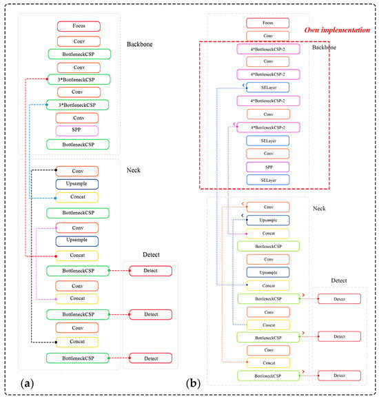 Concise visual comparison of two neural network architectures for fruit detection: (a) the original YOLOv5 and (b) the proposed YOLOv5-v1. The left panel (a) shows the conventional structure of YOLOv5 with repeated bottleneck CSP layers, while the right panel (b) illustrates an augmented design of YOLOv5-v1 with additional bottleneck CSP layers and squeeze-and-excitation (SE) layers within the backbone and neck, ending in detection layers. This comparative layout underscores the modifications of the proposed YOLOv5-v1 aimed at improving the feature extraction and inference performance.