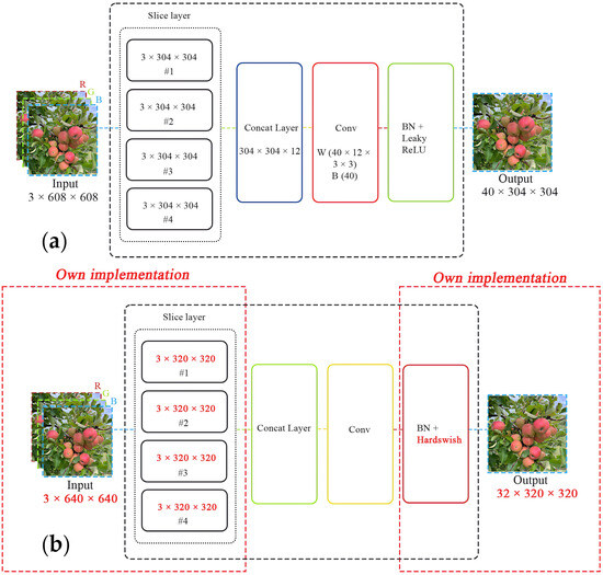 Figure 5. The figure presents two object detection processing pipelines and compares (a) a conventional approach of the original YOLOv5 with (b) an enhanced implementation of the proposed YOLOv5-v1. Both start with an input image sliced into multiple segments, proceed through the convolution and concatenation layers, and conclude with output images that have undergone batch normalization and activation functions. At the same time, the modified version introduces new dimension values for the input RGB channel (3 × 640 × 640) and feature maps (3 × 320 × 320) in the slice layer and suggests the Hardswish activation function in the focus module, hinting at efficiency gains. - A bottleneck layer is employed in the cross stage partial (CSP) network. The BottleneckCSP module incorporated into the YOLOv5-v1 architecture, as depicted in Figure 5, entails eliminating the convolutional layer that was previously used in the original BottleneckCSP module to combine the input feature map through a concatenation operation (refer to Figure 6). In the revised BottleneckCSP module, the input feature map is now directly connected to the output feature map depth-wise, leading to fewer parameters in the module.
