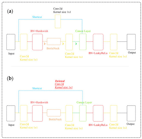 Figure 6. Comparison of two configurations within the BottleneckCSP module: (a) YOLOv5 with a shortcut connection and multiple convolutional layers with batch normalization (BN) and Hardswish activation functions, leading to a concatenated layer and output; (b) YOLOv5-v1 with one convolutional layer removed, leading to fewer parameters in the module. - The feature maps are merged. The proposed YOLOv5-v1 employs a technique to merge variously sized feature maps into a single, more discriminative feature map to improve the detection precision of structural objects in video frames. This improvement considers both the simplified design of the updated BottleneckCSP module and the integration of feature maps from the convolutional layers in YOLOv5-v1. Specifically, the original layer mergers from layers 4 to 15, 6 to 11, and 10 to 21 in the original YOLOv5 architecture have been altered to layers 5 to 18, 8 to 14, and 13 to 24 in the enhanced YOLOv5-v1 architecture.