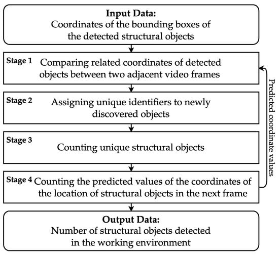 The workflow for tracking the specified structural objects in video analysis. First, the system identifies the coordinates of bounding boxes around the detected objects. These coordinates are compared across successive frames to establish the continuity of the objects. New objects are assigned unique identifiers. The system then counts the distinct structural objects and predicts their subsequent frame coordinates. Finally, the output data enumerate the detected objects within the operational environment.