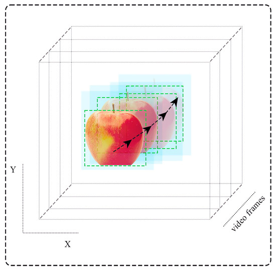Scheme of the tracking of a structural object across multiple video frames within a three-dimensional coordinate system. Successive frames capture the object’s movement, with each frame layer representing a snapshot in time, and superimposed green bounding boxes tracking the object’s path through space.