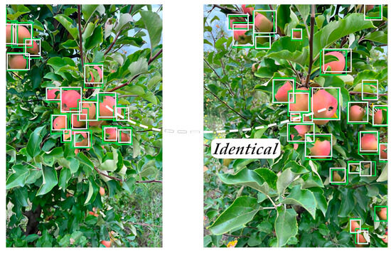 To accurately count the number of fruits in a video stream, it is crucial to uniquely identify each fruit across two consecutive video frames captured by a UAV. Tracking the fruits is a challenging task due to potential changes in their position and appearance across consecutive frames. These changes could be caused by variations in lighting conditions, camera movements, adjustments to the UAV’s flight path, or other unforeseen environmental influences. The method we have developed for counting these structural objects hinges on correlating the visual characteristics of the detected fruits across consecutive video frames. This correlation considers the unique features of each fruit, their positional changes across frames due to UAV movement, and various environmental factors. A visual representation of this counting method is provided in Figure 7.