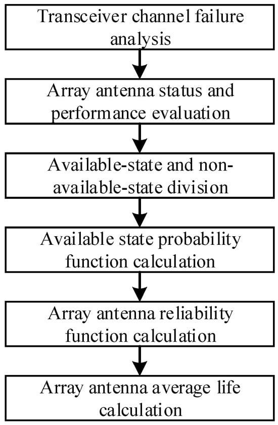 Six steps are included in the array antenna reliability evaluation process, as shown in Figure 1. The transceiver channel’s failure will be analyzed first. Then the array antenna’s status and performance would be evaluated. Based on the array antenna’s performance analysis, the array antenna’s state could be divided into available-state and non-available-state. Then the probability of all available states could be calculated, and the array antenna’s reliability function could be established. At last, the array antenna’s average life could be calculated.