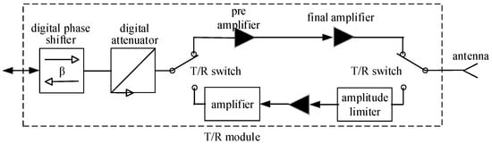 In the transceiver channel structure shown in Figure 2, the probability of the antenna’s failure is small. The T/R module is an electronic module composed of a variety of RF devices. The probability of the T/R module’s failure conforms to the exponential distribution law, that is, its fault probability function is []