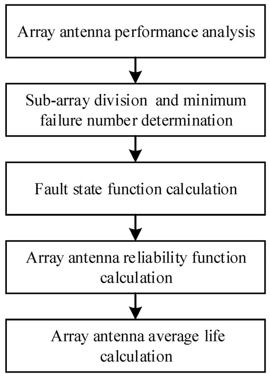 There are five steps in the reliability calculation flow for large-scale array antennas shown in Figure 2. That is array antenna performance analysis, subarray division and determination of the minimum number of faults, fault state function calculation, array antenna reliability function and average life calculation.