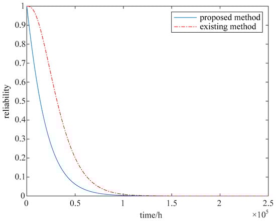 The array antenna’s reliability is analyzed with the proposed method. When the array antenna is working normally, the maximum secondary lobe level threshold is set as SLLL = −21 dB. Then the 232 = 1,048,576 states of the array antenna are analyzed, and the maximum secondary lobe level of each state is analyzed. All the available states are determined according to the threshold, and finally, the total number of available states is 120. The probability function of each available state is calculated using Equation (5), and the array antenna’s reliability is calculated with Equation (6). The array antenna’s reliability is evaluated with the proposed method and the existing method [], as shown in Figure 5. When calculated using existing methods, the average life of the array antenna is 35203h. When calculated using the proposed method in this paper, the average life of the array antenna is 18,937 h.