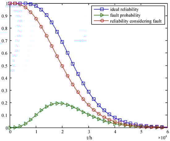 The failure rate of the transceiver channel is set as λ = 4.5 × 10−6/h, and the ideal reliability of the array antenna, the probability of the array antenna’s fault state, and the array antenna’s reliability considering the fault impact are analyzed by using Formulas (1), (4) and (5), respectively. And the results are shown in Figure 6 and Table 5.