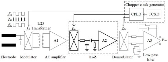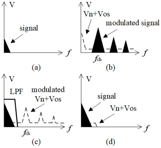 Chopping is a technique that continuously employs the modulation and demodulation processes to separate signals from low-frequency noise and offset voltages. The circuit consists of four basic sections: a modulator, AC amplifier, demodulator, and low-pass filter. Figure 1 illustrates the principle of the chopper amplifier [17]. In the modulator, the original signal is first modulated to a high frequency using a square-wave signal. The modulated signal is then amplified using an AC amplifier. The AC amplifier generates a 1/f noise Vn and DC offset Vos. The 1/f noise of the amplifier is high, whereas the high-frequency noise is relatively low. The amplifier amplifies the signal at high frequencies. Thus, the SNR can be improved. The spectra of Vn and Vos are shifted to higher frequencies using a synchronous demodulator. The low-pass filter eliminates the effects of Vn and Vos.
