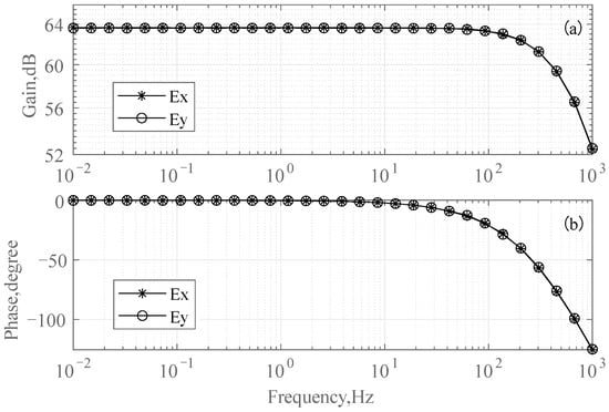 Characteristics of the gain and phase relative to frequency. (a) Amplifier magnitude vs. frequency response. (b) Amplifier phase vs. frequency response. The low-pass filter −3 dB bandwidth range is 300 Hz. Ex and Ey represent the two channels of the ultralow-noise chopper amplifier, respectively. The frequency responses of the two channels nearly coincide.