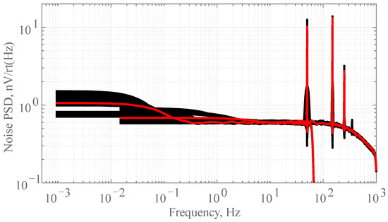 For voltage noise measurements, we shortened the input of the chopper amplifier and placed it in a three-layer permalloy shielding box to prevent external electromagnetic interference. A low-noise data logger was used to record the output noise of the chopper amplifier. The sampling rate of the special data logger was set to 150 Hz and 2400 Hz to ensure the accuracy of the low-frequency noise. The typical noise level was 500 nV/rt (Hz) and 200 nV/rt (Hz) at 0.001 Hz and 1 Hz, respectively. Power was supplied via a 25.2 V 2 Ah Li-ion battery. The data logger supports outputting a low-noise ± 2.5 V voltage to power the ultralow-noise chopper amplifier. The data logger and Li-ion battery were placed inside another shielding box. The box was well connected to the ground. For the low-frequency noise PSD measurement, we conducted a 6 h output noise recording, as shown in Figure 5.