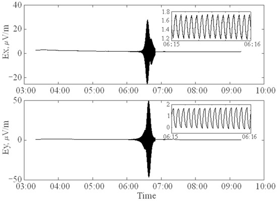 Sample time series collected from transmitted CSEM and natural varied MT signals. The receivers show the 0.25 Hz signal from the transmitter. The Ey recording (bottom) is slightly larger than that of Ex (top), with both receiver antennas being 8 m. The horizontal axis indicates time, expressed in hh:mm.