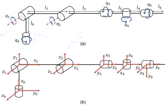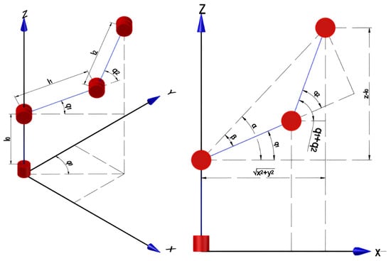 Furthermore, the Euler angles denoted as are regarded as observed in Equation (11) for the reference systems associated with the orientation, specifically in the final three links. The constituent elements of the robot are established, thereby enabling the resolution of its inverse kinematics.