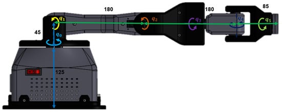 The dimensions of the robotic arm are depicted in Figure 4. In addition, the extent of rotation for each joint aligns with the values presented in Equation (12).
