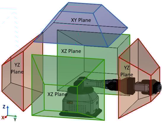 The identification of the major workspace was based on the assumption of a stationary robotic wrist. The movement of the object exhibits characteristics akin to those of a hemispherical shell with a diameter measuring 85 mm. Establishing a manipulator orientation in each quadrant allowed for the conduct of graphical motion analysis. The workspace for each plane was determined and subsequently reduced to a specific area where the relevant planar zones depicted in Figure 5 could be obtained. The blue hue symbolizes the upper quadrant in the XY plane, while the green hue signifies the lateral quadrants in the XZ plane. Lastly, the red hue indicates the front and rear quadrants in the YZ plane.