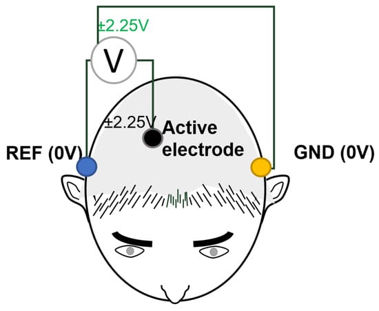 The gNautilus Research helmet with 64 g SAHARA electrodes from the Gtec brand was used as the receiver of the EEG signals. This features 24-bit precision at a 250 Hz sampling rate, 2.4 GHz digital transmission, and a range of 10 m. This helmet utilizes an application programming interface that has been specifically built by the manufacturer to facilitate signal acquisition. To establish a reference signal (REF) and a virtual ground (GND), the electrodes were positioned on the mastoids, as depicted in Figure 7. The resolution of the analog-to-digital converter is ±2.25 volts. The electrodes were strategically positioned in proximity to the parietal and occipital lobes because of the enhanced precision observed during the experimental procedure. The electrodes chosen for the study were P4, P6, P07, P03, P04, and POZ, which follow the internationally recognized 10–20 electrode placement system.