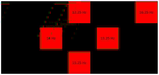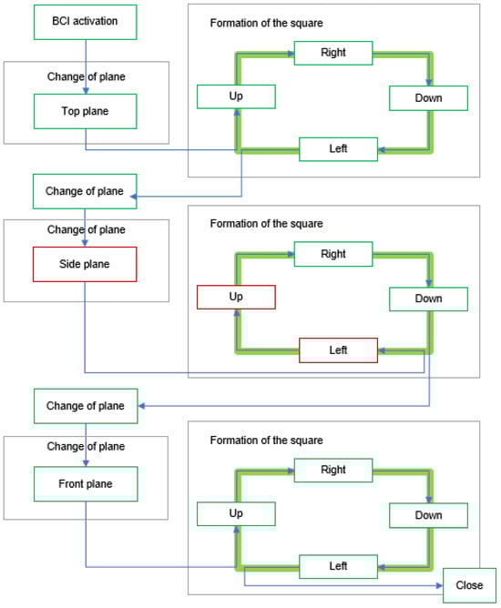 A BCI interface with a straightforward and uncluttered design was implemented to reduce potential distractions. The system’s design is structured around three distinct windows, namely, the start window, the plane selection window, and the movement selection window. The initial screen is designated for the activation of the system, whereas the subsequent two screens employ the SSVEP paradigm. Users concentrate their attention on the red boxes that correlate to the desired action for the robotic arm, specifically during the defined stimulation period. The color red was selected for its high visual appeal, enhancing the patient’s focus and leading to better outcomes. The frequencies selected for the implementation of the SSVEP paradigm are 12.25, 13.25, 14, 15.25, and 16.25 Hz, as depicted in Figure 8.