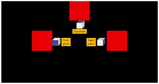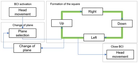 A graphic depiction of the support system’s actions during the first test session, forming the square in the side plane, is shown in Figure 22. The robotic arm’s initial location is displayed in Figure 22a. In the subsequent stage, denoted as Figure 22b, a proper choice is executed by transitioning to the intended side plane. The correct execution of the “Up” command in Figure 22c results in the proper movement of the robotic arm.