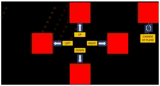 The movement selection window encompasses a set of five instructions: up, down, left, right, and change of plane. These commands are associated with the movement direction of the robotic arm and facilitate the transition to a different working plane, as depicted in Figure 11.