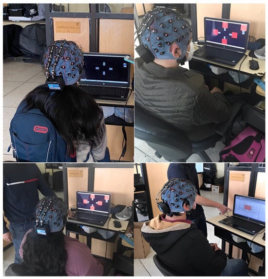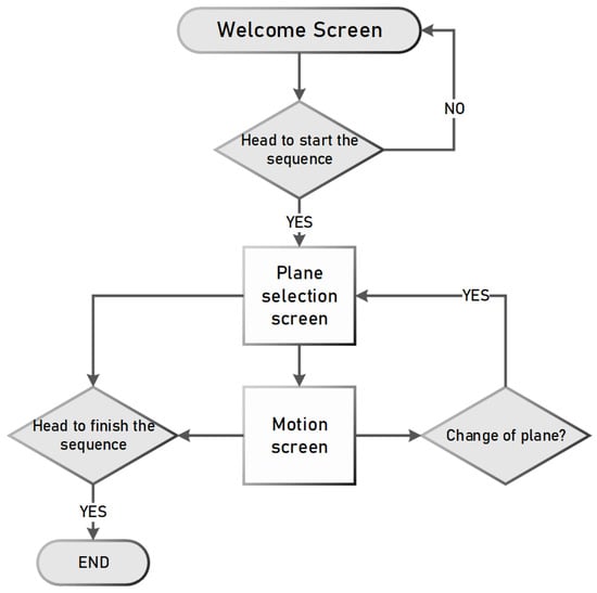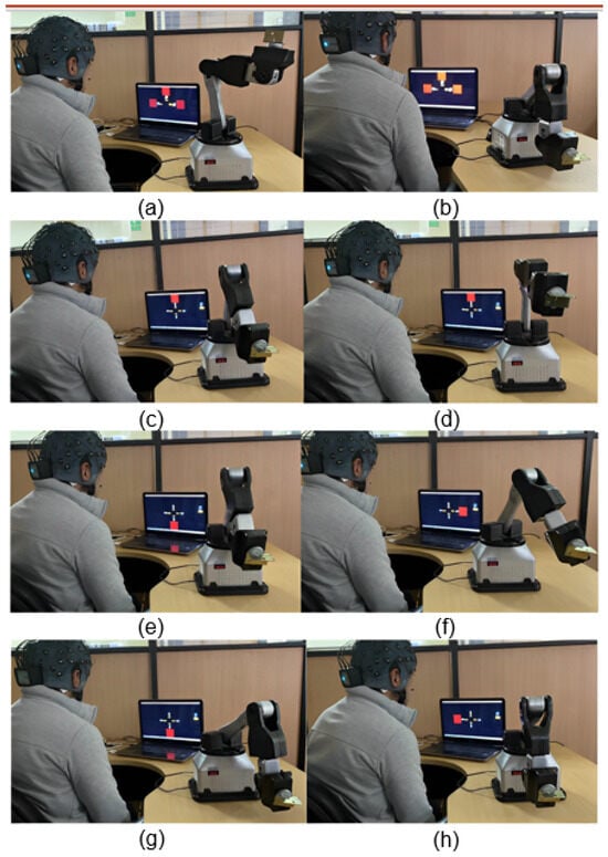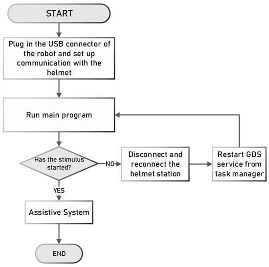 The implementation of the assistive device was carried out in a straightforward and user-centric manner. The operational sequence is illustrated in Figure 12. It is important to establish a connection between the robotic arm and the program, ensuring that the stimulus is activated. Alternatively, the helmet facilitates the process of restarting, enabling the reestablishment of the station’s connection with the computer. Once the sequence has been launched, the user should proceed with the process as depicted in Figure 13.
