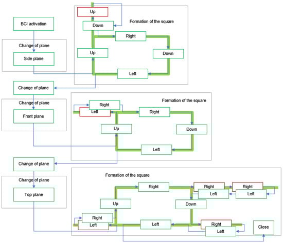 At the initial session, the trajectories depicted in Figure 20 were created, forming a frame in the lateral, frontal, and upper planes. Errors were present in all three instances. Nevertheless, these errors could be rectified by employing a supplementary command. The summary results were obtained and are presented in Table 11. A total of 29 orders were necessary, out of which 23 were accurately executed. The obtained results demonstrate a mean accuracy of 79.31% for the BCI throughout the execution of the designated task.